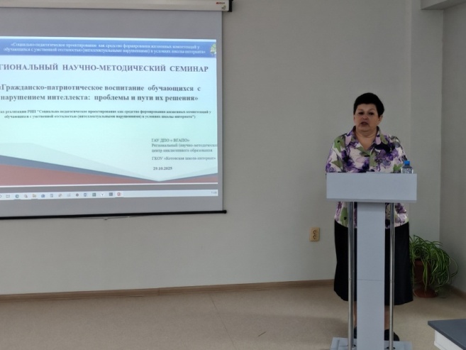 29 октября 2025 года при методической поддержке регионального (научно-методического) центра инклюзивного образования ГАУ ДПО «ВГАПО» в государственном казенном общеобразовательном учреждении «Котовская школа-интернат» состоялся региональный научно-методический семинар по теме: «Гражданско-патриотическое воспитание обучающихся с нарушением интеллекта: проблемы и пути их решения», мероприятие прошло в рамках региональной инновационной площадки ГКОУ «Котовская школа-интернат»: «Социально-педагогическое проектирование как средство формирования жизненных компетенций у обучающихся с умственной отсталостью (интеллектуальными нарушениями) в условиях школы-интерната».